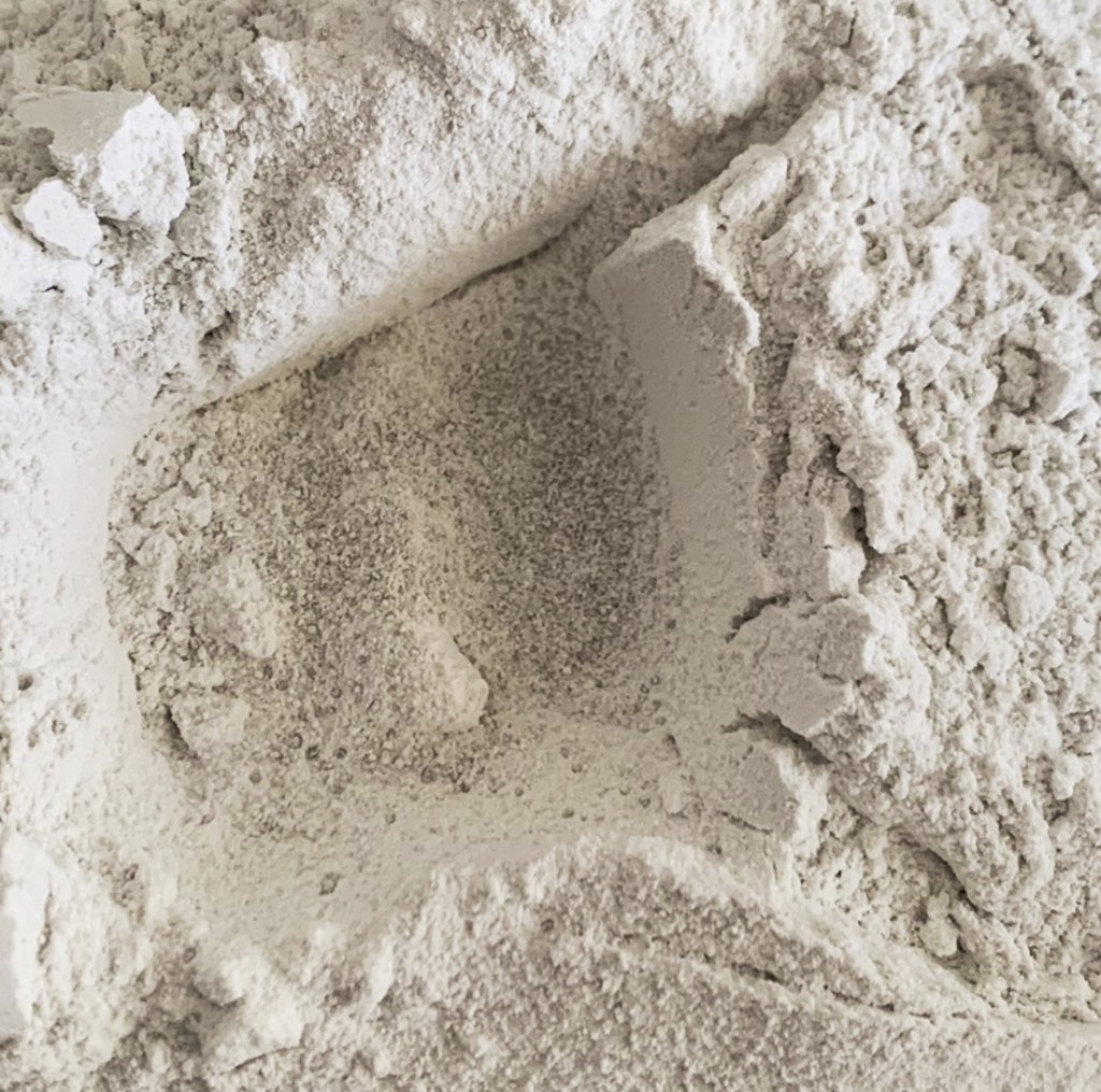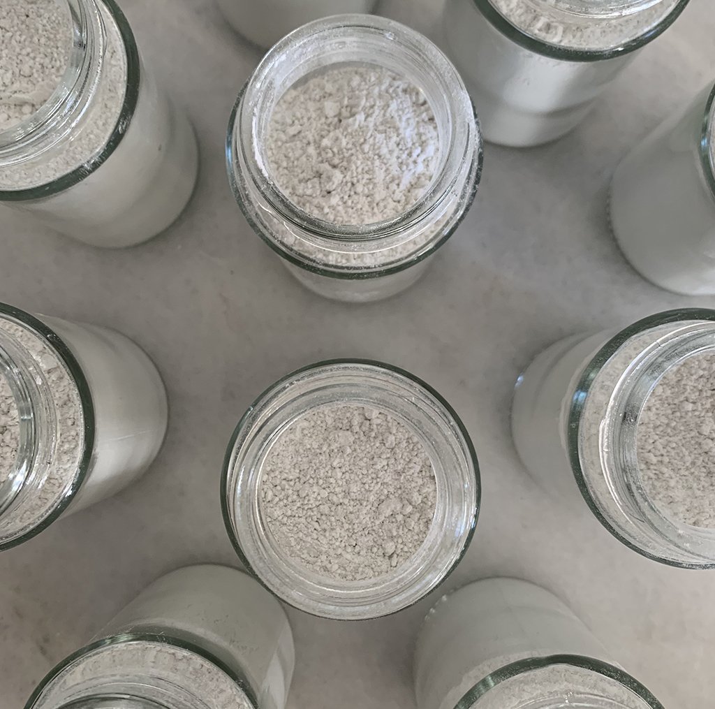 arcilla de caolín, almidón de maíz, bicarbonato de sodio y blend de aceites esenciales: árbol de té y lavanda.